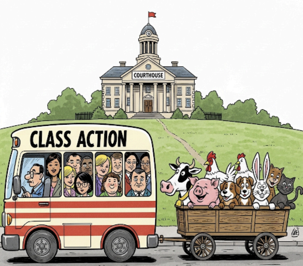 Class actions often grab headlines: recall the massive Equifax data breach, Facebook's improper data sharing, Visa's unlawful charges, and the Purdue Pharma opioid scheme. Although animals were not victims in these cases, class actions often arise in contexts where they are the underlying victims and could indirectly benefit from such actions. In those contexts, while animals are not — and are not permitted by law to be — plaintiffs, they are, as suggested in the article image above, effectively “along for the ride” with these human class actions. This article examines the potential of class actions to indirectly drive positive change for animals, as well as the challenges class actions face.